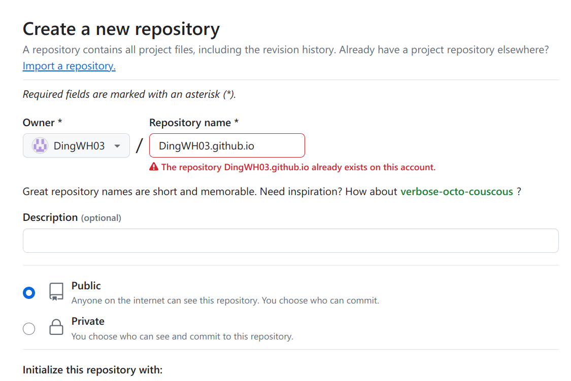 我们需要创建两个仓库来完成操作,其中一个仓库名随意,我使用的名称是hexo-blog,另一个仓库名必须以yourusername.github.io为名字,在创建时会提示你这个仓库是特殊仓库,如下图(因为我预先创建过了,显示仓库已存在)。其中yourusername.github.io仓库必须设为public。