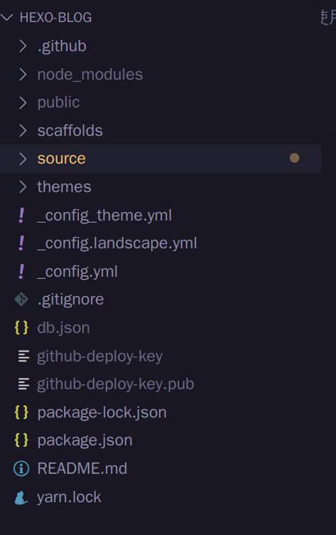 node_modules是nodejs自动生成的模块目录,public是编译出的静态页面地址,scaffolds是自动新建的页面或博客模板文件,source中存放页面和post的源文件(.md形式)以及部分图片,其中页面单独成一个目录,博客文件则存放在_posts中,关于post和页面的区别请见post和page的区别,theme中存放主题。