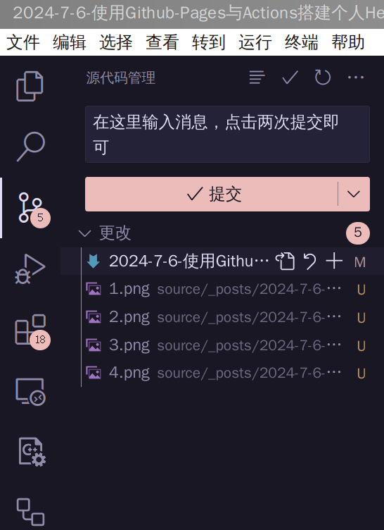 然后试试vscode的源代码管理功能吧。这里第一次点击提交是提交更改,第二次则是同步到仓库,第一次提交时必须填写消息。